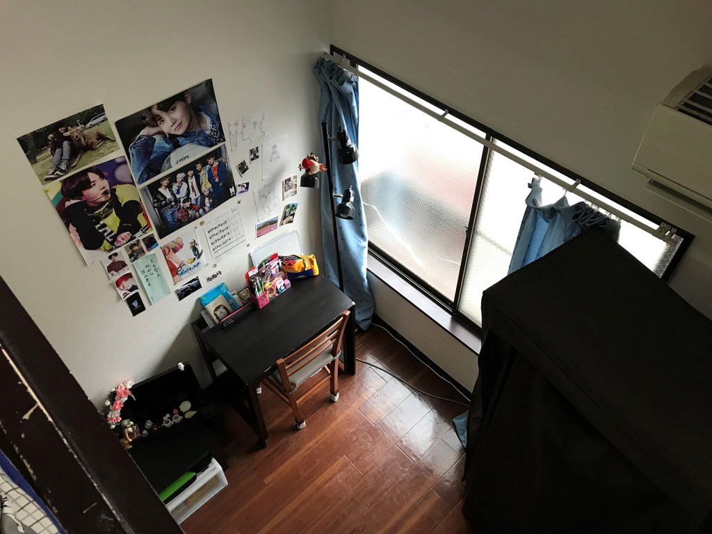 The idea of a one-room apartment (very common in big cities) did not appeal to me so much. The loft was my secret dream, because you can separate the “living” from the “sleeping”, and the ceiling is taller. Also, in one-rooms you may tend to eat on the bed, or live on the bed, which I did not like. I had the chance to find this little beauty and book it from Switzerland before going to Tokyo. You cannot imagine the fear, I asked myself many times: “What if it is horrible?”, but when I entered it was exactly how I imagined it (maybe just a little bit older than expected). It was good so in the end I kept living there for two years! I had everything I needed: An entrance with space for shoes and toilet supplies; a “unit” toilet; a kitchen with some space in between the fire and the sink (essential!); a sofa and a tv; a little (very little) desk; a wardrobe; and a second floor with a big futon (yes, I slept on a futon for two years!). After a couple of months, I added another big drawer near the sofa and two little drawers under the tv, very useful to keep food, documents, and school’s materials. I had lots of wall space so with time I also attached many posters and pictures on it (from the Korean group BTS to pictures with friends).